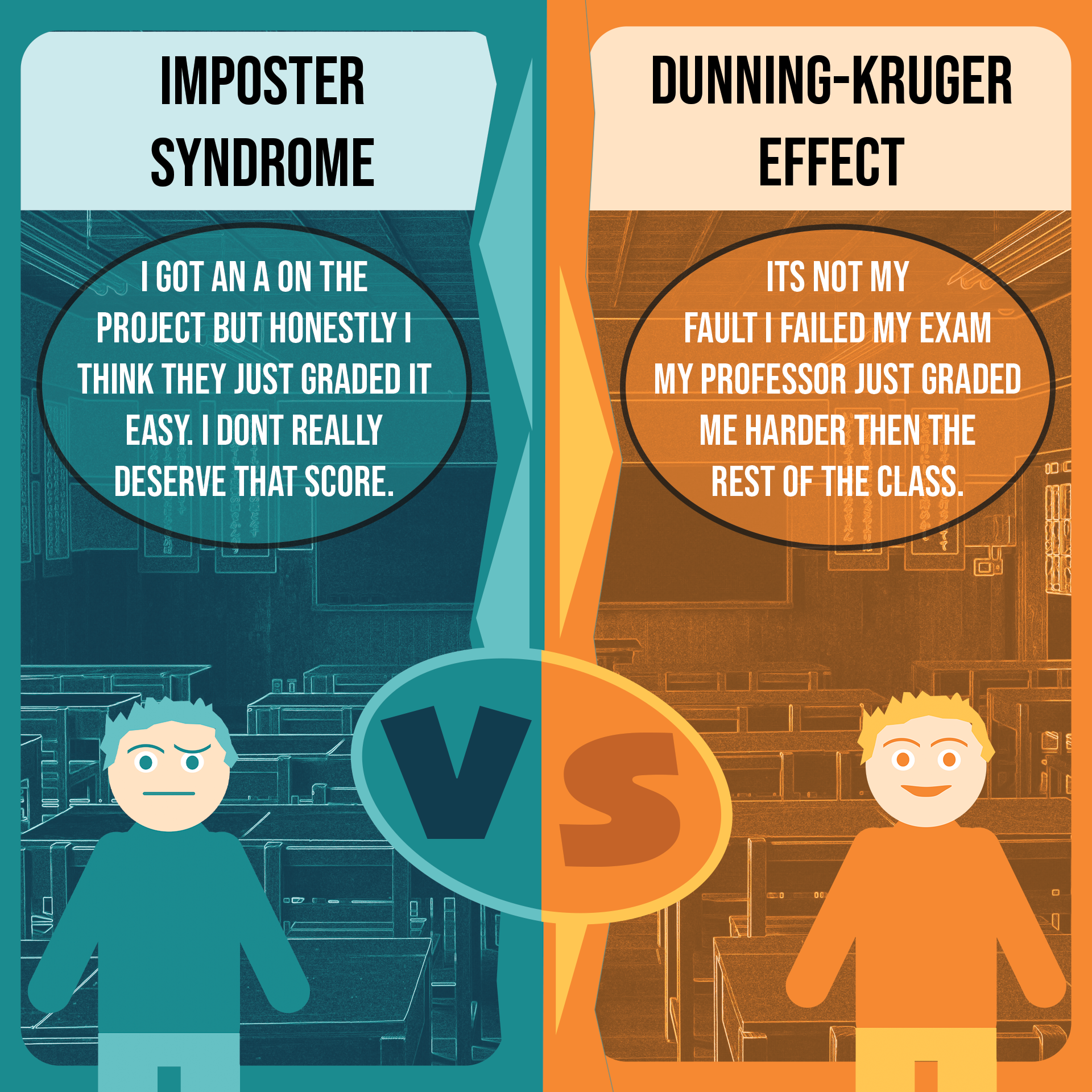 The goal of this project was to explore Imposter Syndrome and the Dunning–Kruger Effect, two psychological concepts that strongly affect creative professionals. I needed to create a visual piece (or series of pieces) that explained these ideas in a way that related personally to me and to people in creative fields. I decided on a series of graphic designs using a consistent layout and VS-style split to highlight the contrast between the two mindsets.
